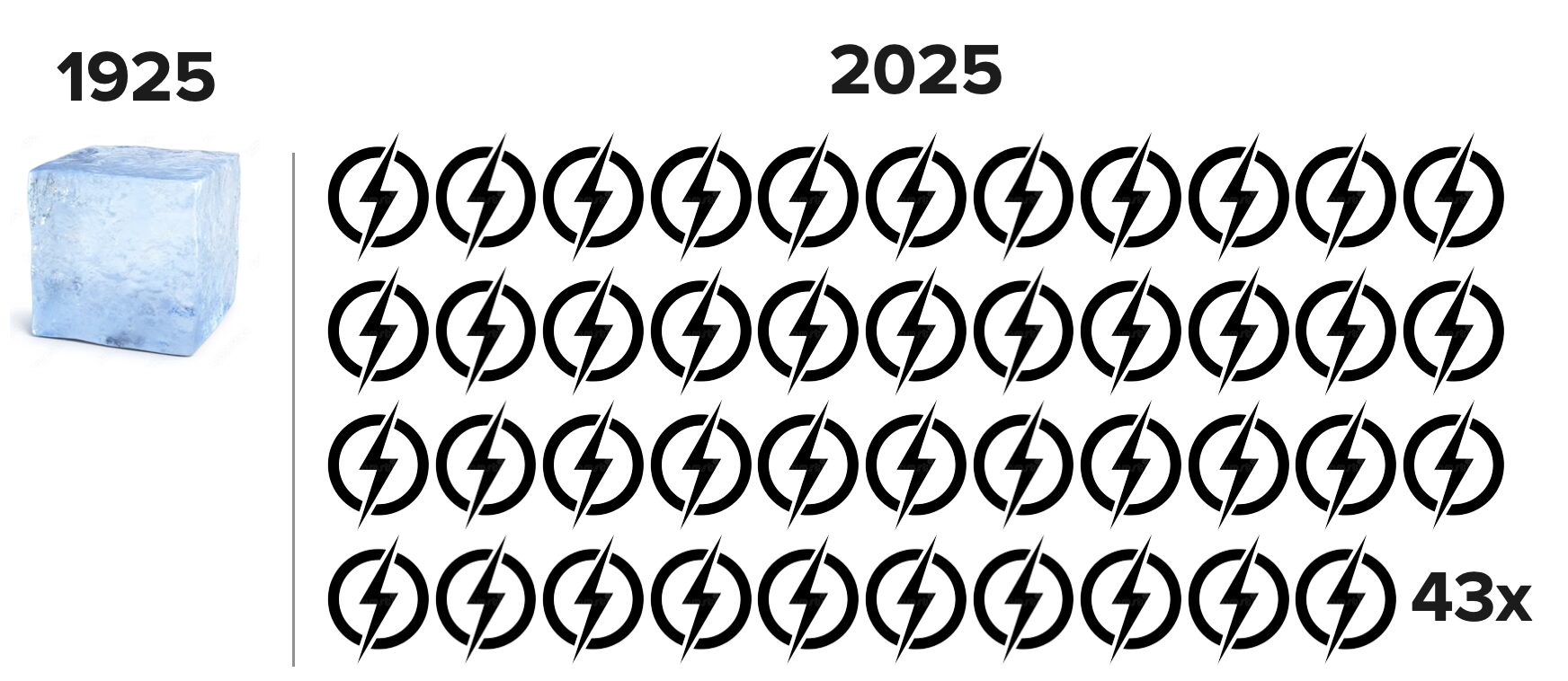 For the time it took a worker in 1925 to earn the money to buy ice cooling for a day, workers today get 43 days of electric cooling.