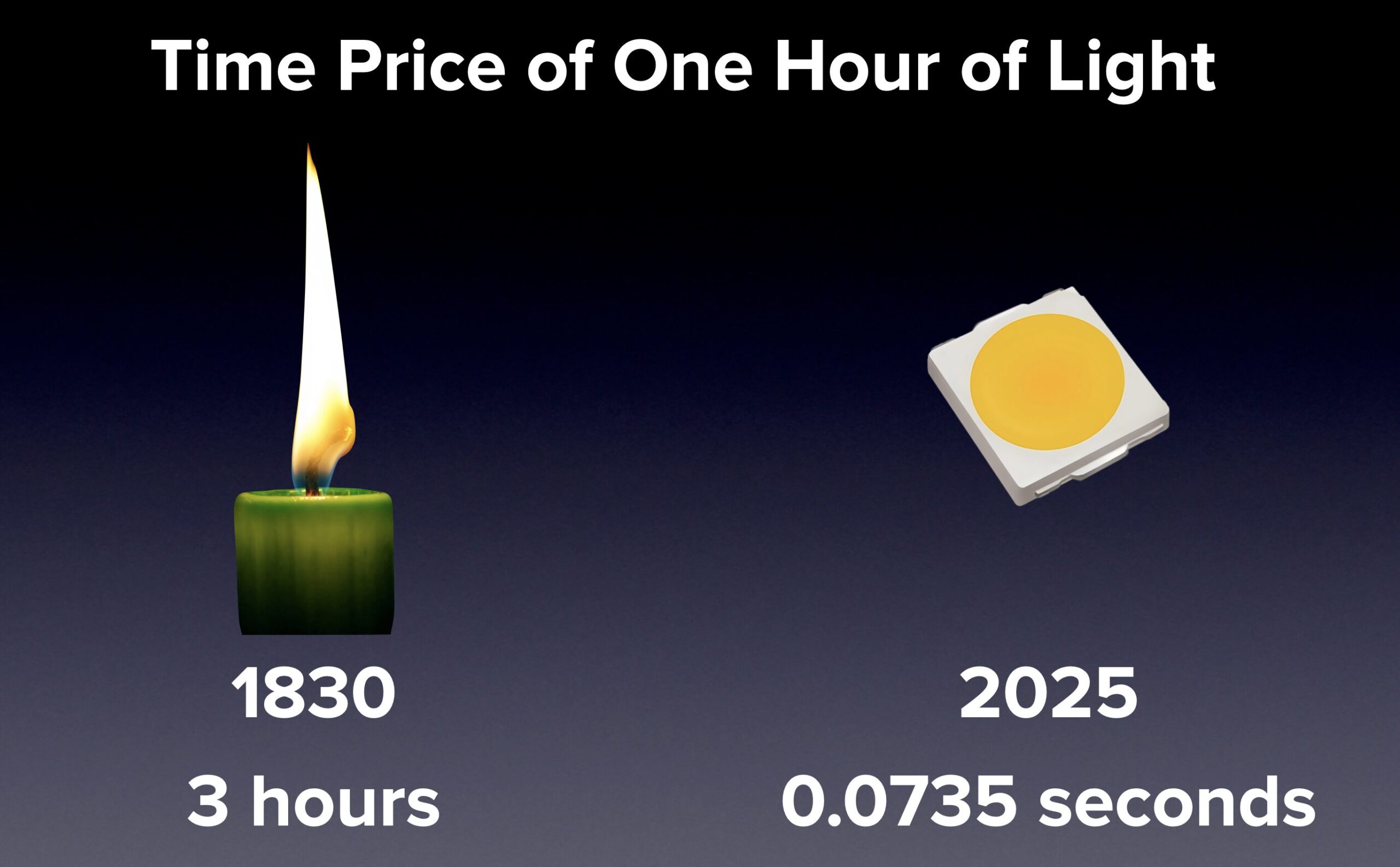 Our book Superabundance (2022) was inspired in part by the work of Nobel Prize–winning economist William Nordhaus, who conducted an extensive analysis on the “time price” of light over the span of human history. He called time prices the true prices. Light can be measured in lumens. Comfortable reading light is around 1,000 lumens. Nordhaus reported that in 1830, earning sufficient money to buy the candles necessary for one hour of light at 1,000 lumens required around three hours of labor. A candle generates around 12 lumens; therefore, one would need 83 candles to generate 1,000 lumens.