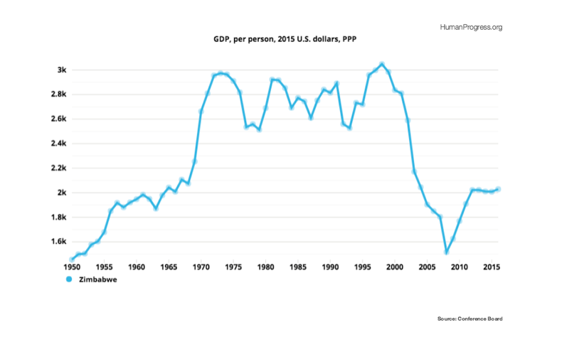 First, let’s briefly look at Mugabe’s legacy. Since coming to power in 1980, the dictator presided over years of economic stagnation and, eventually, decline. Judging by the data, incomes in what was then Rhodesia, roughly doubled between 1950 and 1973. Following the outbreak of the Bush War (i.e., the African struggle for independence from the European rule), incomes declined, but quickly rebounded after the end of hostilities and onset of majority rule. That’s where they remained until Mugabe’s catastrophic decision to expropriate commercial land in the early 2000, which wiped out half-century of income growth.