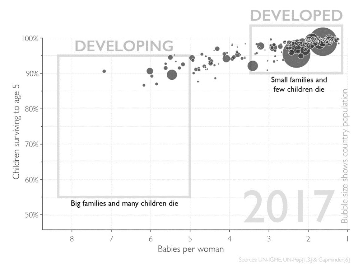 Around the neatly clustered countries, Rosling drew two boxes aligning with the smug students’ inclinations, humming with confirmation bias satisfaction: a clear divide between developed countries where women have few children, few of whom die, and developing countries where women have lots of children, but many of them die.