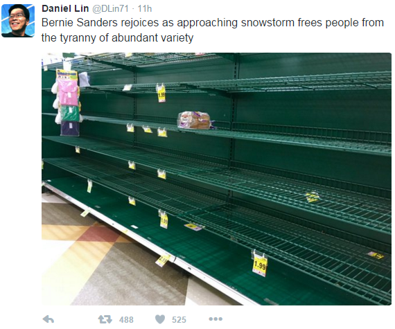 When grocery-shopping for the impending blizzard, many on the U.S. East Coast faced extremely limited choices.