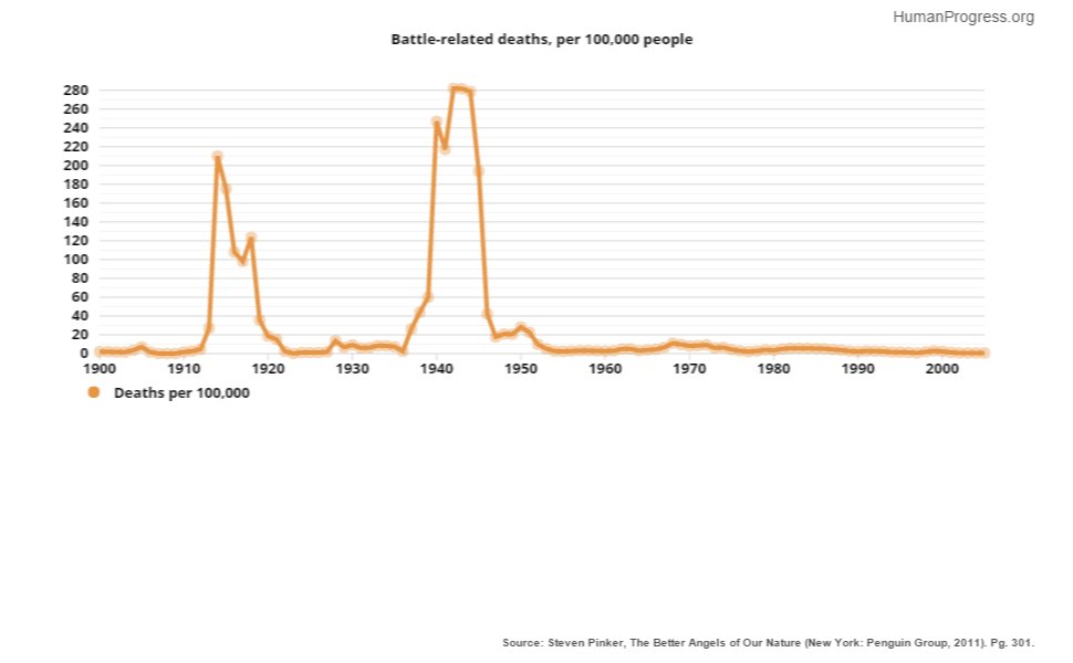 While war deaths are certainly more visible than ever, with television and the Internet bringing scenes of flag-draped coffins into our living rooms, far fewer people ever see battle firsthand. After adjusting for population growth, the data shows that despite the noted exception of the World Wars, battle deaths have become rarer since 1900.