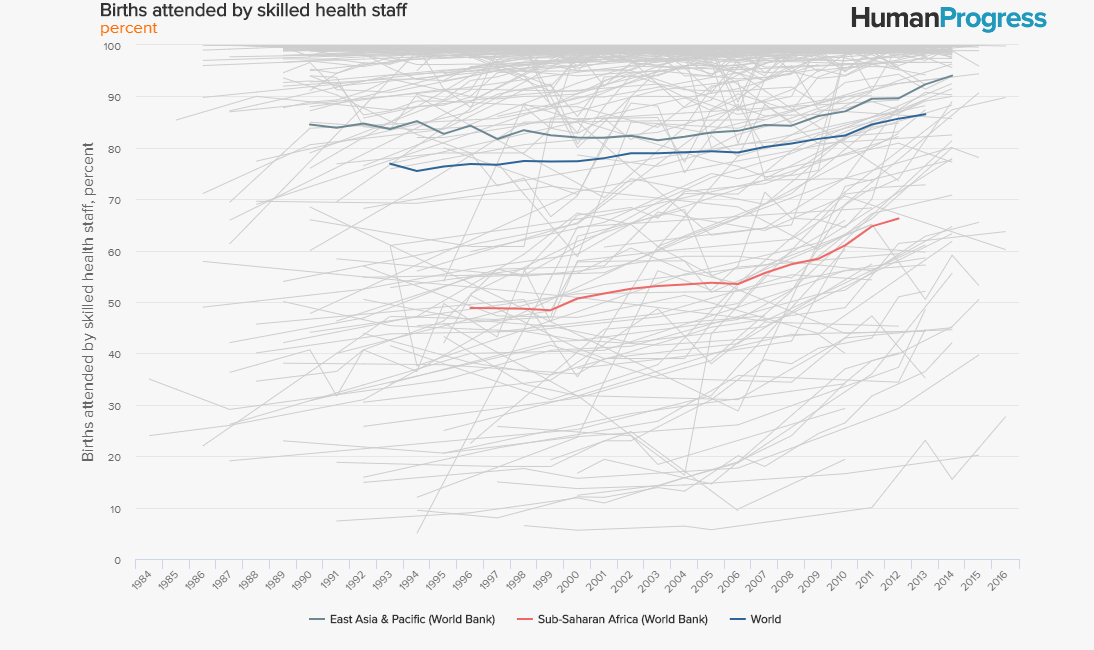 While wide disparities remain between the rich and poor countries, the share of births attended by skilled health staff has also improved. The World Bank defines skilled health staff as “personnel trained to give the necessary supervision, care, and advice to women during pregnancy, labor, and the postpartum period; to conduct deliveries on their own; and to care for newborns.” Assistance by such trained professionals during birth reduces the incidence of maternal and newborn deaths. So, a rising share of births attended by skilled health staff is an indicator of progress. In East Asia and the Pacific, the share of births attended by skilled health staff rose from less than 85 percent to over 94 percent from 1990 to 2014. In poorer sub-Saharan Africa, the share of births attended by skilled health staff grew from only 49 percent—less than half of all births—in 1996, to over 66 percent in 2012.