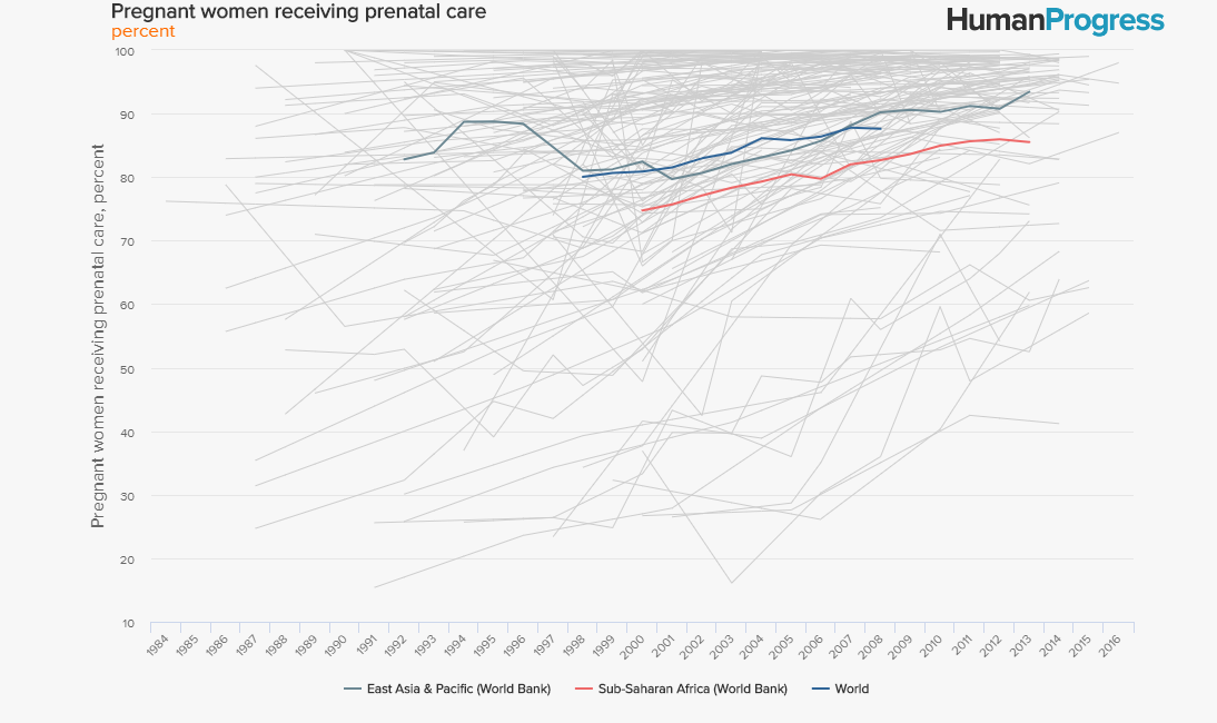 Part of the reason why pregnancies involve fewer complications than in the past, and are less likely to conclude with the mother’s death, is that pregnant women around the world are more likely to receive prenatal care than in the past. Even in sub-Saharan Africa, the world’s poorest region, a majority of pregnant women now receive prenatal care. That region’s share of pregnant women receiving prenatal care increased from 74.7 in the year 2000 to 85.5 in the year 2013. When one considers how much sub-Saharan Africa’s population has grown during that time—by over 280 million people—it becomes especially clear that the number of additional women receiving prenatal care is significant.