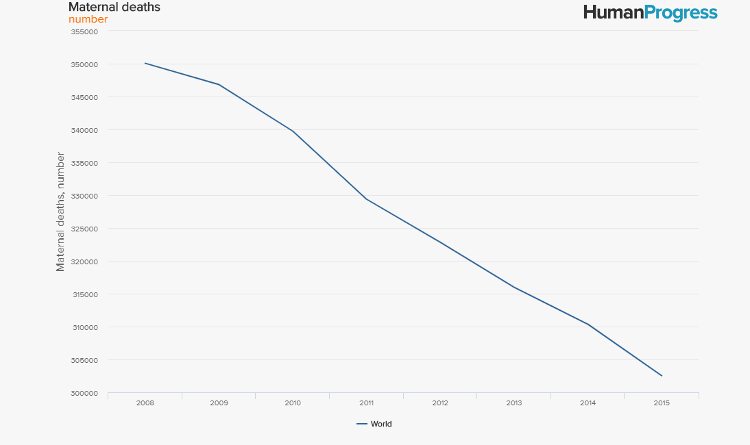 The decrease in the rate of maternal mortality has been so dramatic that the total number of such deaths has also fallen. Between 2008 and 2015, the total number of yearly maternal deaths declined by 47,535, despite a global population increase of over 593 million people over the same time period. With so many more people in the world, it would be possible for the rate of maternal deaths to decline even as the total number of such deaths did not. But happily, the total number of deaths in childbirth has also come down.