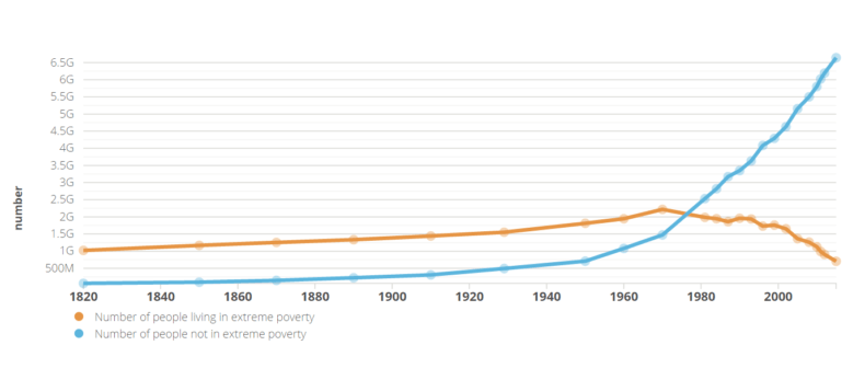 Not only has the percentage of people living in poverty declined, but the number of people in poverty has fallen as well – despite massive population growth. There are also more people alive who are not in penury than there have ever been. From 1820 to 2015, the number of people in extreme poverty fell from over a billion to 700 million, while the number of people better off than that rose from a mere 60 million to 6.6 billion. (Extreme poverty is again defined here as living on $1.90 a day, adjusted for inflation and differences in purchasing power.)