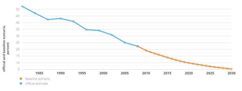 If progress continues on its current trajectory, the Brookings Institution estimated in 2013 that extreme poverty (this time defined as living on $1.25 a day, again adjusted for inflation and differences in purchasing power) will all but vanish by 2030, affecting only 5 per cent of the global population. This is what they considered to be the “baseline” or most likely scenario. In the best-case scenario, they predicted that by 2030 poverty will decrease to a truly negligible level, affecting only 1.4 per cent of the planet’s population.