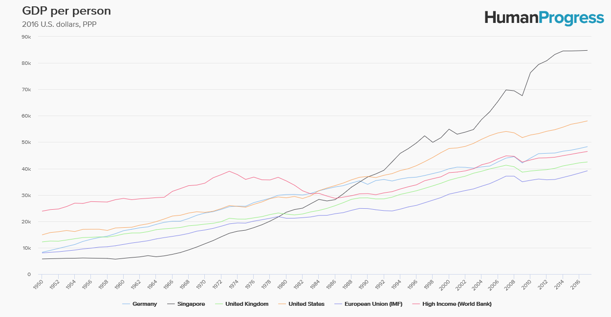 Over the same time period, average gross domestic product per person adjusted for inflation and purchasing power rose by 483 percent in Germany, 1,376 percent in Singapore and 290 percent in the United States. Overall, GDP per person in high income countries rose from $9,251 to $47,149 (in 2016 dollars) or 410 percent.