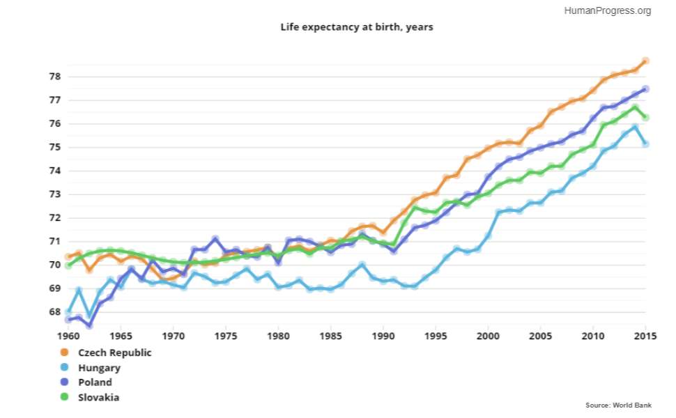 Revisiting the life expectancy statistics some three decades later, a different picture emerges. Between 1960, the first year for which World Bank data is available, and 1989 (i.e., a period of 29 years), life expectancy in the Czech Republic, Hungary, Poland and Slovakia rose by 1.33, 1.46, 3.36 and 1.05 years respectively. Between 1989 and 2015 (i.e., a period of 26 years), it increased by 7.1, 5.68, 6.44 and 5.24 years respectively. The post-communist dip in life expectancy, such as it was, proved to be small and temporary.