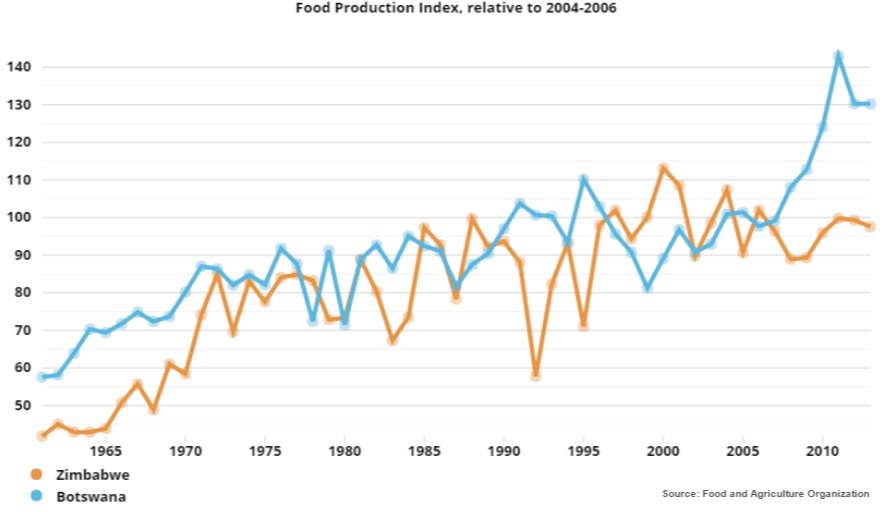 Thankfully for the Zimbabwean dictator, there are plenty of gullible Westerners willing to believe that the frighteningly vile and comically incompetent government isn't at the root of Zimbabwe's food shortages, but that global warming is to blame. Of course, this is pure nonsense. Botswana and Zimbabwe share a border and their climate and natural resources are exceptionally similar. Yet, since 2004, food production has increased by 29 percent in Botswana, while declining by 9 percent in Zimbabwe. It is not drought but government policies that make nations starve!